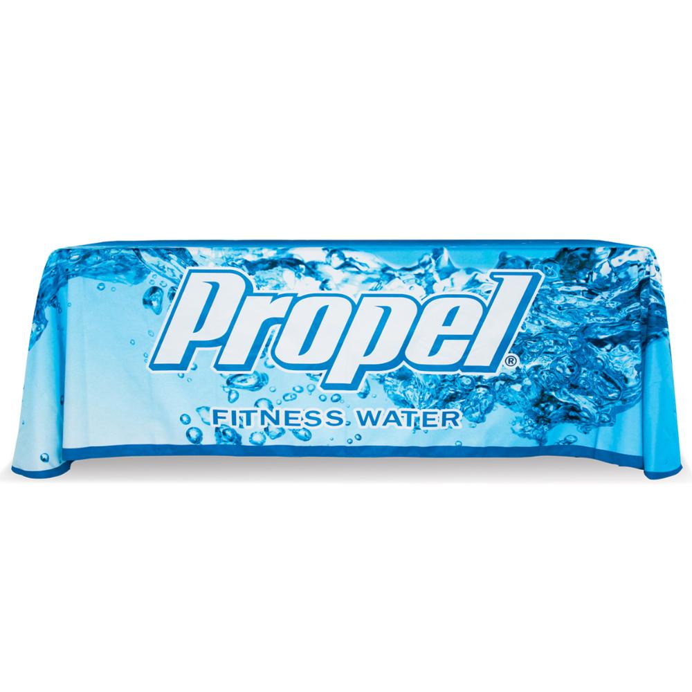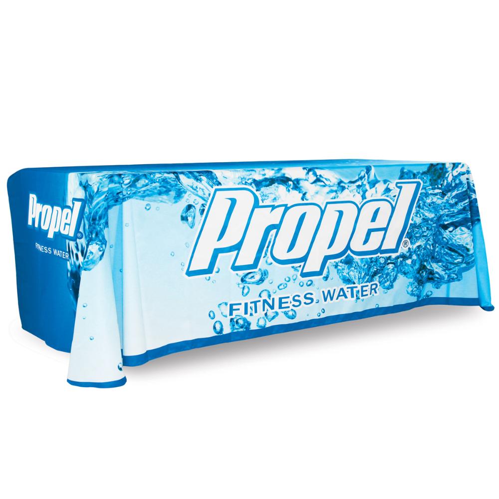 Table throws are a great addition to your trade show booth and are sized to fit standard 4ft, 6ft, and 8ft tables. Available in full graphic prints. This Backless version has full length front and side material, with a shorter edge on the backside. (The Full Back version has full length material on the front, back and both sides of the table.)
